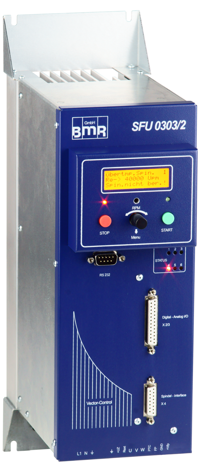Frequency converter for sensorless operation of AC- and BLDC spindles Rotational speeds up to 240000 Upm (4000Hz) Continuous output power: 3600VA / S1-100% at 230V net 2000VA / S1-100% at 115V net Adjustable intermediate circuit realizes highest efficiency on board 200W chopper resistor Safe Torque Off (STO) according to EN60204-1 and Stop-Category 0 according to IEC 61800-5-2